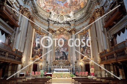 Rzym 14 07 2025 Kościół jezuitów pw. św. Ignacego Loyoli na Polu Marsowym. Koncha absydy nad ołtarzem głównym została ozdobiona przedstawieniem patrona kościoła posługującego chorym na zarazę. Poniżej po lewej przedstawiono Św. Ignacego przyjmującego śluby od św. Franciszka Borgiasza, pośrodku Widzenie św. Ignacego, natomiast po prawej Św. Ignacego błogosławiącego Franciszka Ksawerego. FOTO:HENRYK PRZONDZIONO /FOTO GOŚĆ