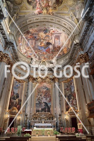 Rzym 14 07 2025 Kościół jezuitów pw. św. Ignacego Loyoli na Polu Marsowym. Koncha absydy nad ołtarzem głównym została ozdobiona przedstawieniem patrona kościoła posługującego chorym na zarazę. Poniżej po lewej przedstawiono Św. Ignacego przyjmującego śluby od św. Franciszka Borgiasza, pośrodku Widzenie św. Ignacego, natomiast po prawej Św. Ignacego błogosławiącego Franciszka Ksawerego. FOTO:HENRYK PRZONDZIONO /FOTO GOŚĆ