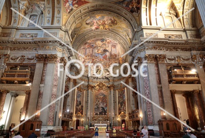 Rzym 14 07 2025 Kościół jezuitów pw. św. Ignacego Loyoli na Polu Marsowym. Apsyda z ołtarzem głównym. Trzy freski wokół ołtarza głównego to XVII-wieczne dzieła jezuity Andrei Pozzo. Przedstawiają one świętego Ignacego Loyolę podczas jego wizji w La Storta, wysyłającego świętego Franciszka Ksawerego do Indii i witającego świętego Franciszka Borgię. FOTO:HENRYK PRZONDZIONO /FOTO GOŚĆ