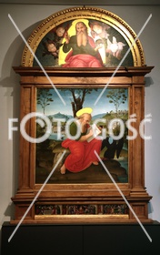 Włochy Perugia 25 06 2025 Muzeum Narodowe Umbrii. Berto di Giovanni 1518 Ołtarz św. Jana Ewangelisty. Święty Jan Ewangelista pisze ewangelię na Patmos. Bóg Ojciec udzielający błogosławieństwa cherubinom. FOTO:HENRYK PRZONDZIONO /FOTO GOŚĆ