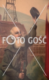 Katowice 09 10 2025 Nikiszowiec, Muzeum Historii Katowic wystawa: " Święci na sprawy wszelkie" Oleodruk święta Barbara - fragment - górnik FOTO:HENRYK PRZONDZIONO /FOTO GOŚĆ
